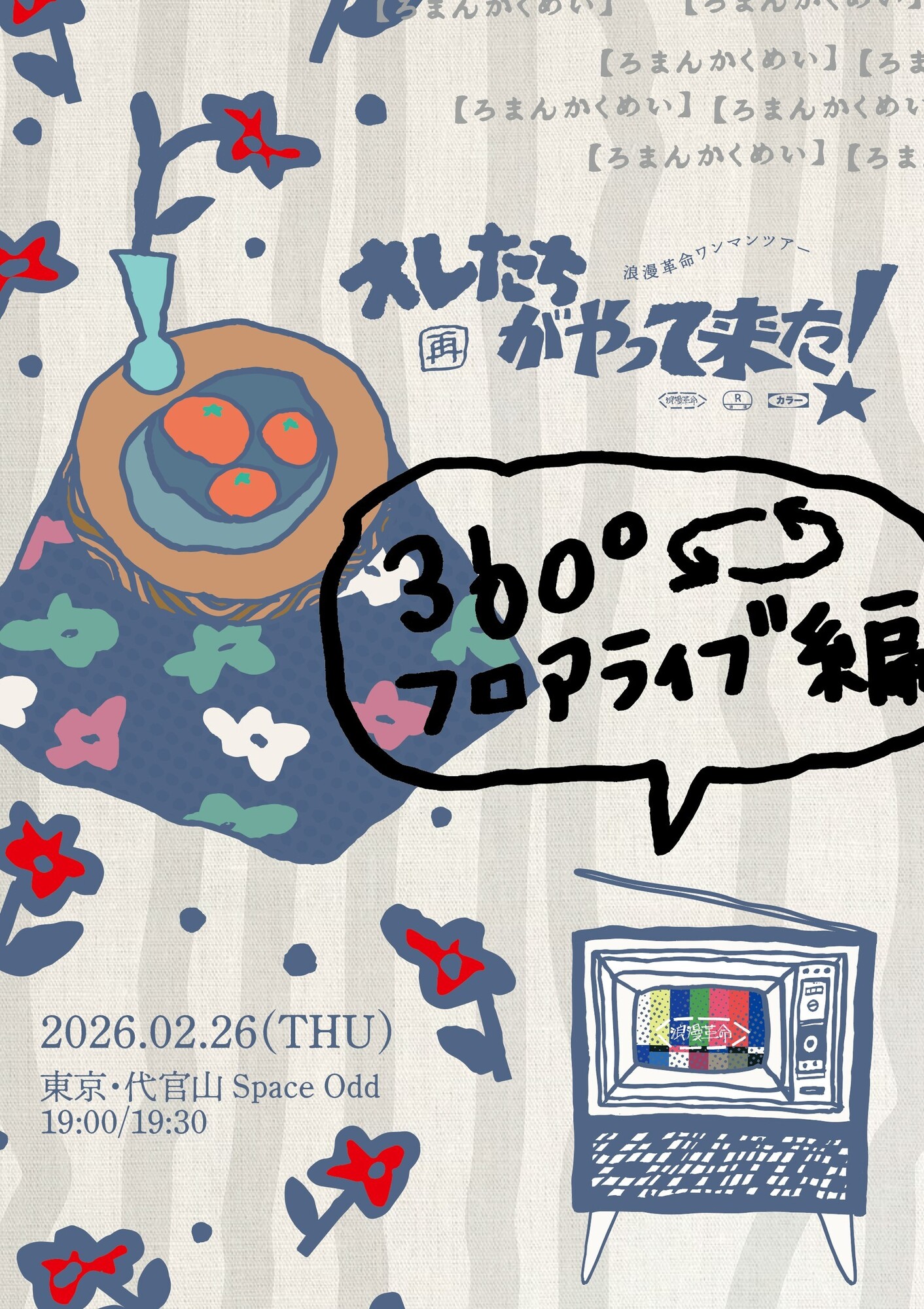 2026.02.26 [再]オレたちがやって来た!360°フロアライブ編(東京) ツイート シェア ■特設ページ https://lit.link/roman_kakumei 日程:2月26日(木) 時間:OPEN/START 19:00/19:30 会場:東京・代官山Space Odd チケット:前売り スタンディング 5,500円 学割(大学生以下、専門学校生含む)4,000円 (税込/D別) お問い合せ:ホットスタッフ・プロモーション 050-5211-6077 一覧へ戻る 前の記事へ